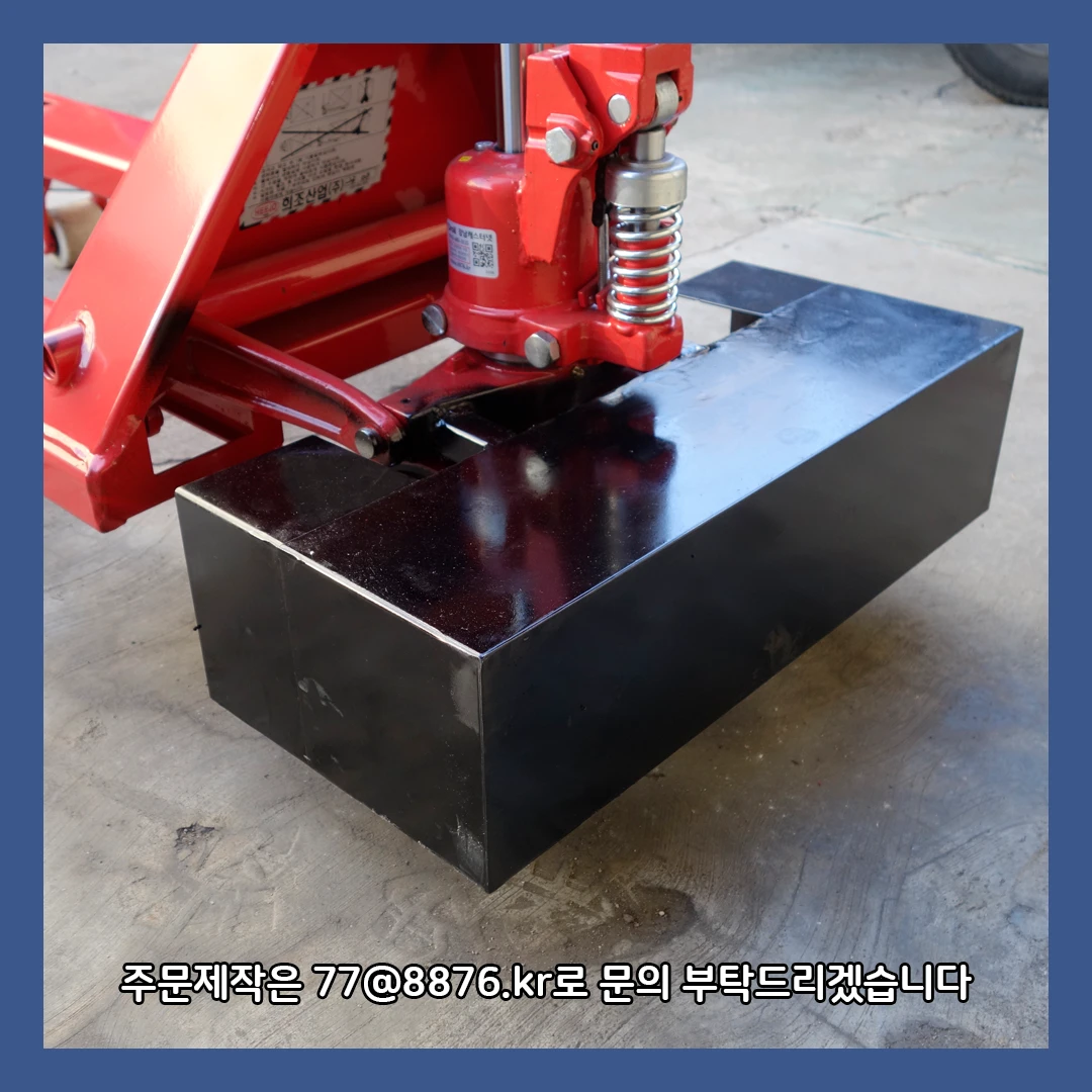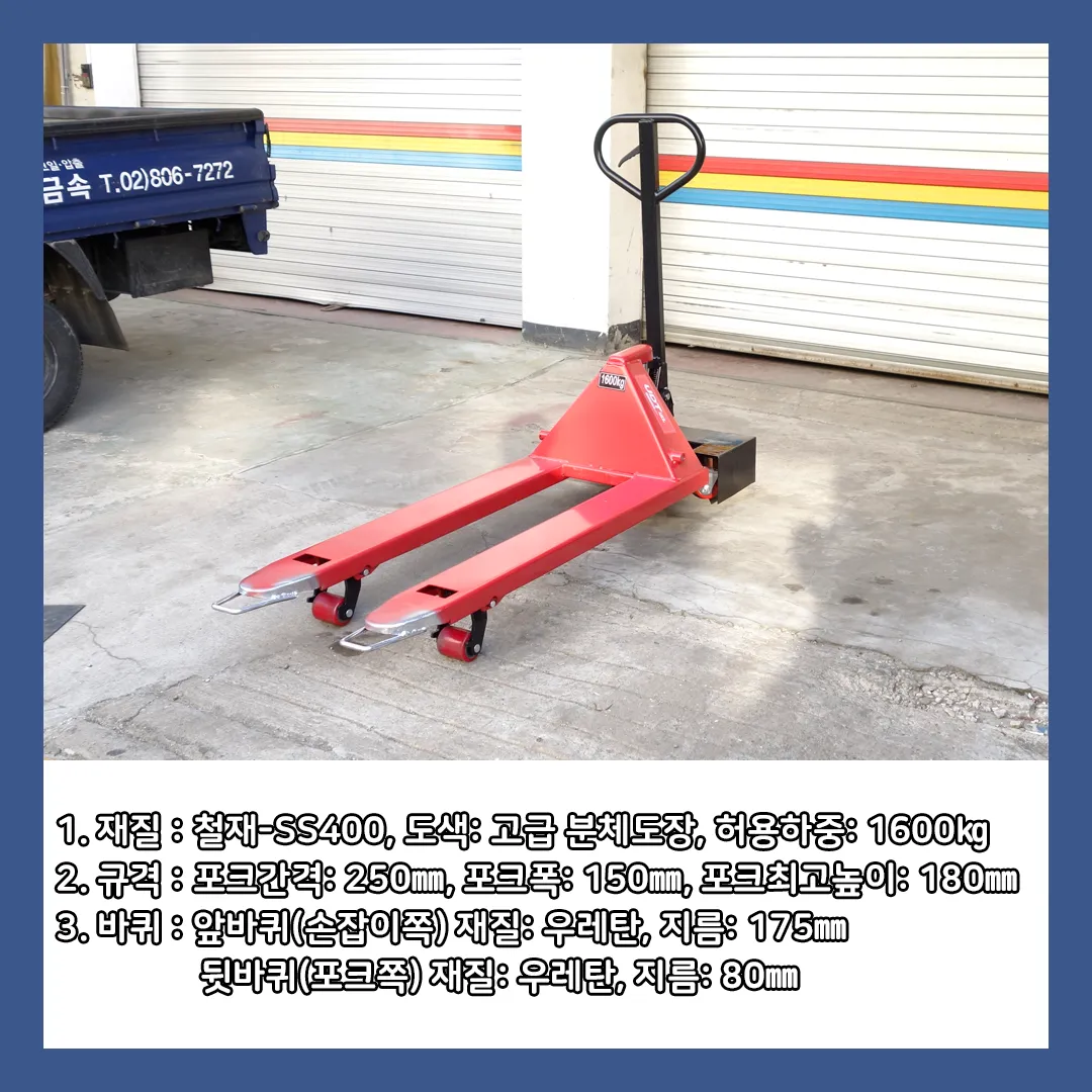 손잡이 쪽에 보조바퀴 2개와 발끼임 방지 커버를 추가하고, 포크 끝에 손잡이 고리를 부착한 맞춤 핸드파레트트럭입니다.